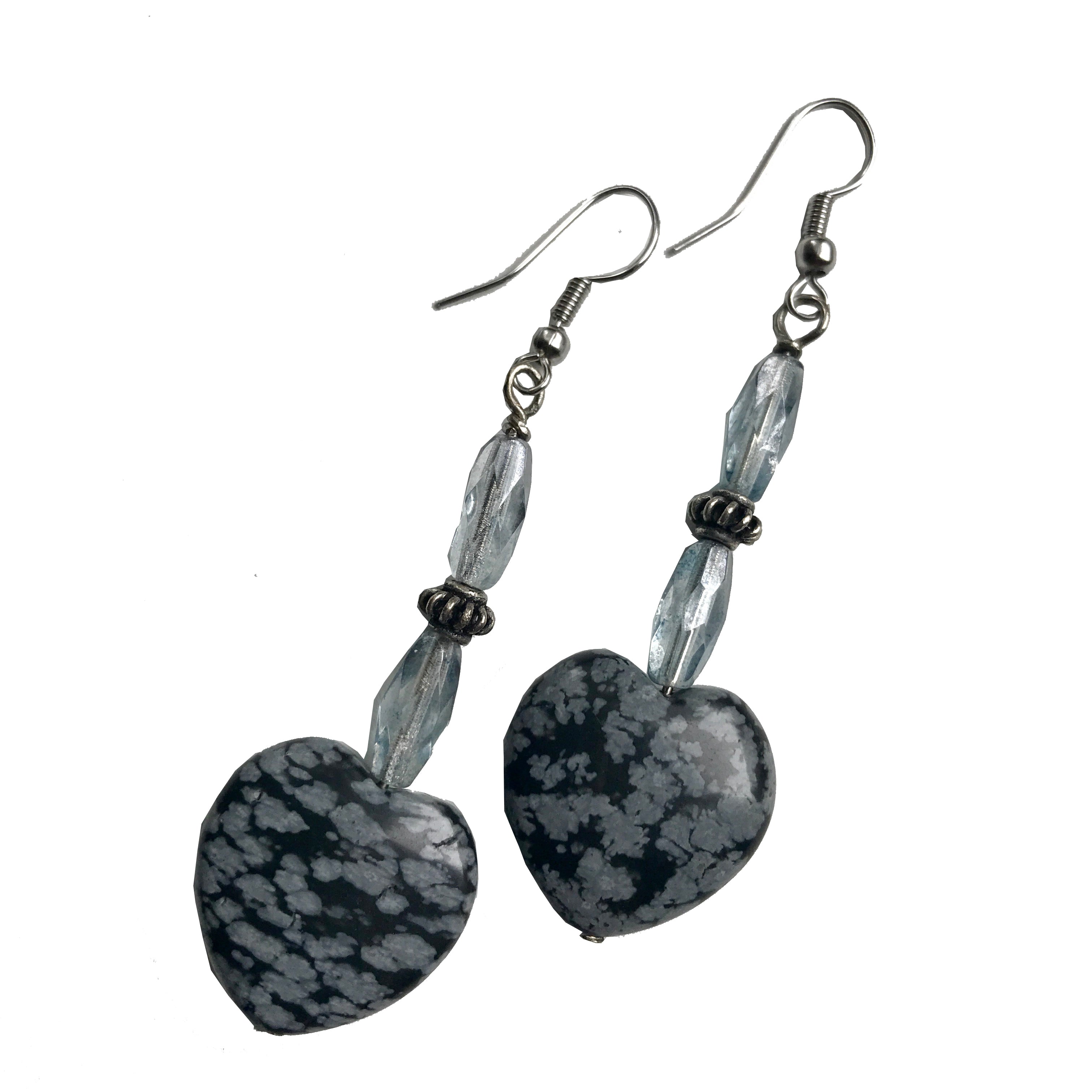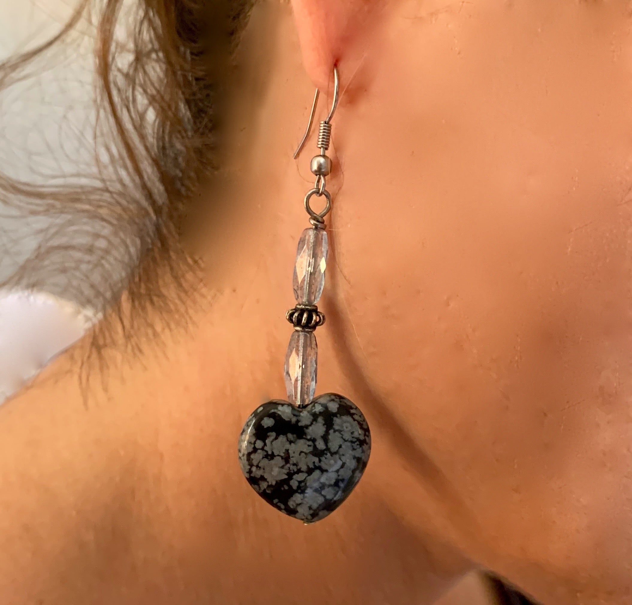 Grounded elegance with a touch of edge. This one-of-a-kind pair features Snowflake Obsidian hearts paired with vintage Czechoslovakian faceted glass beads that catch the light beautifully. These handmade drop earrings bring a sense of balance and effortless sophistication—perfect for dressing up or down.