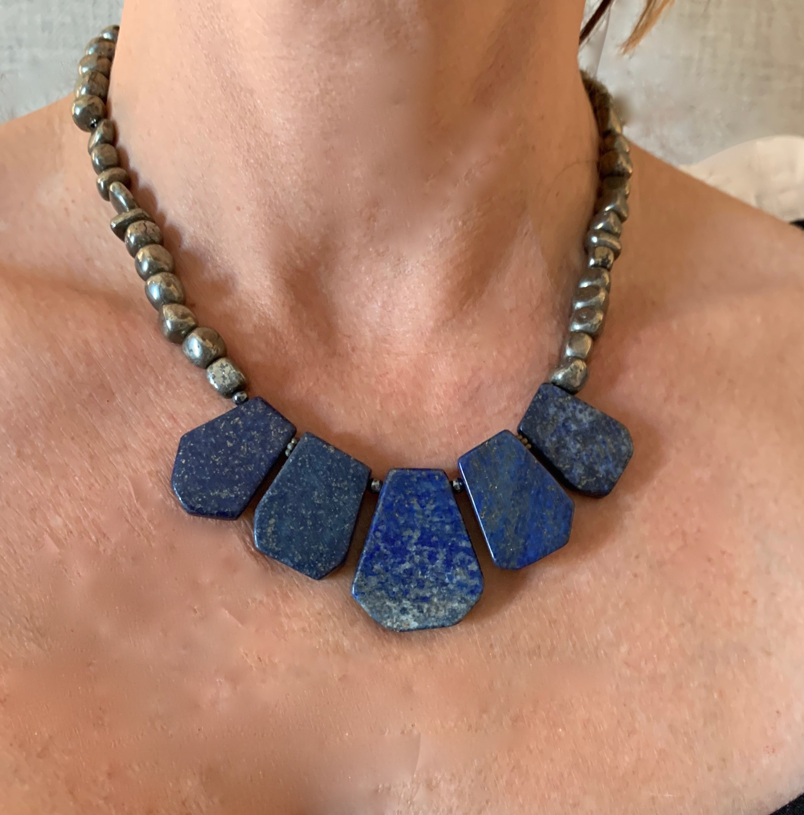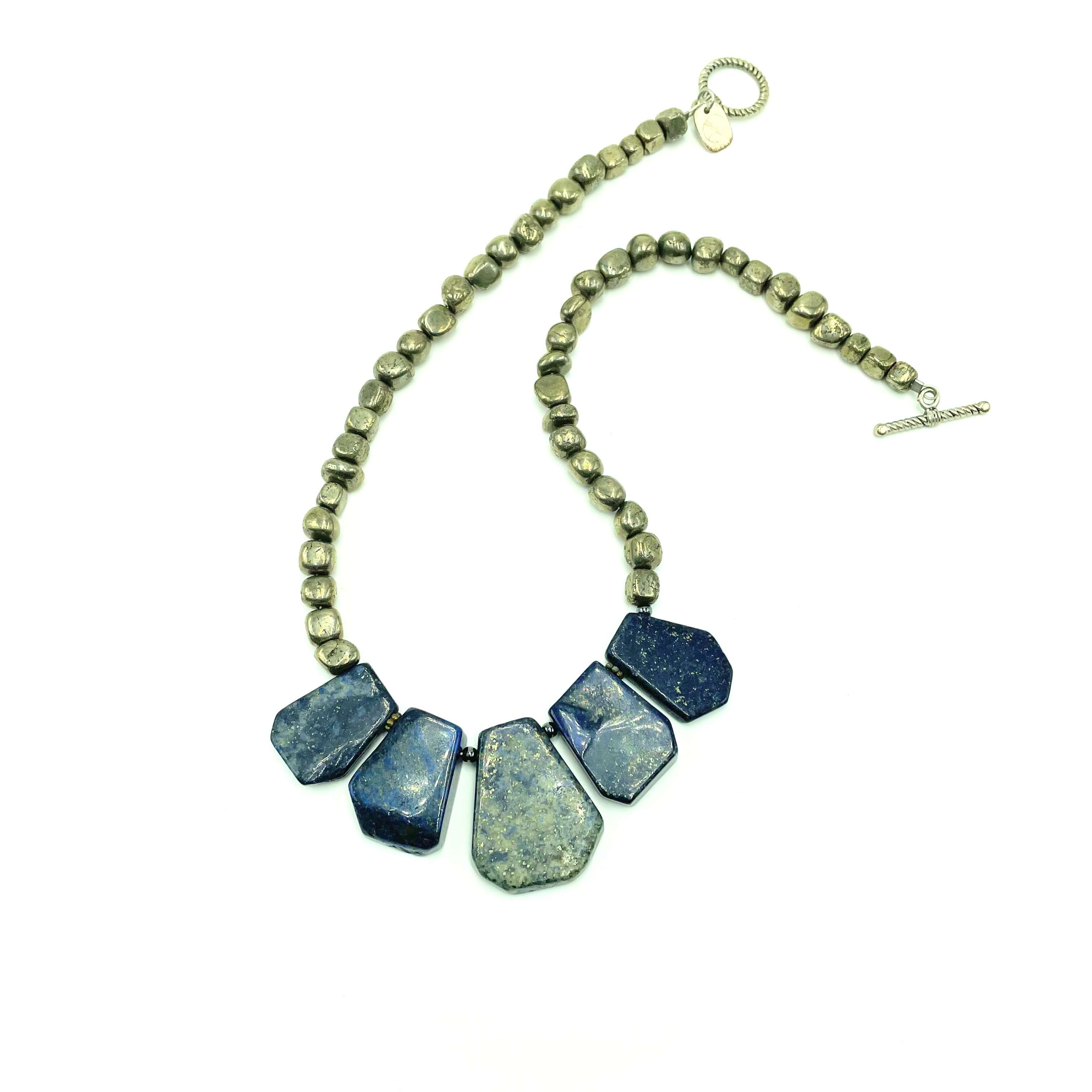 Lapis Lazuli encourages enlightenment and inner strength. Pyrite attracts abundance and positivity.