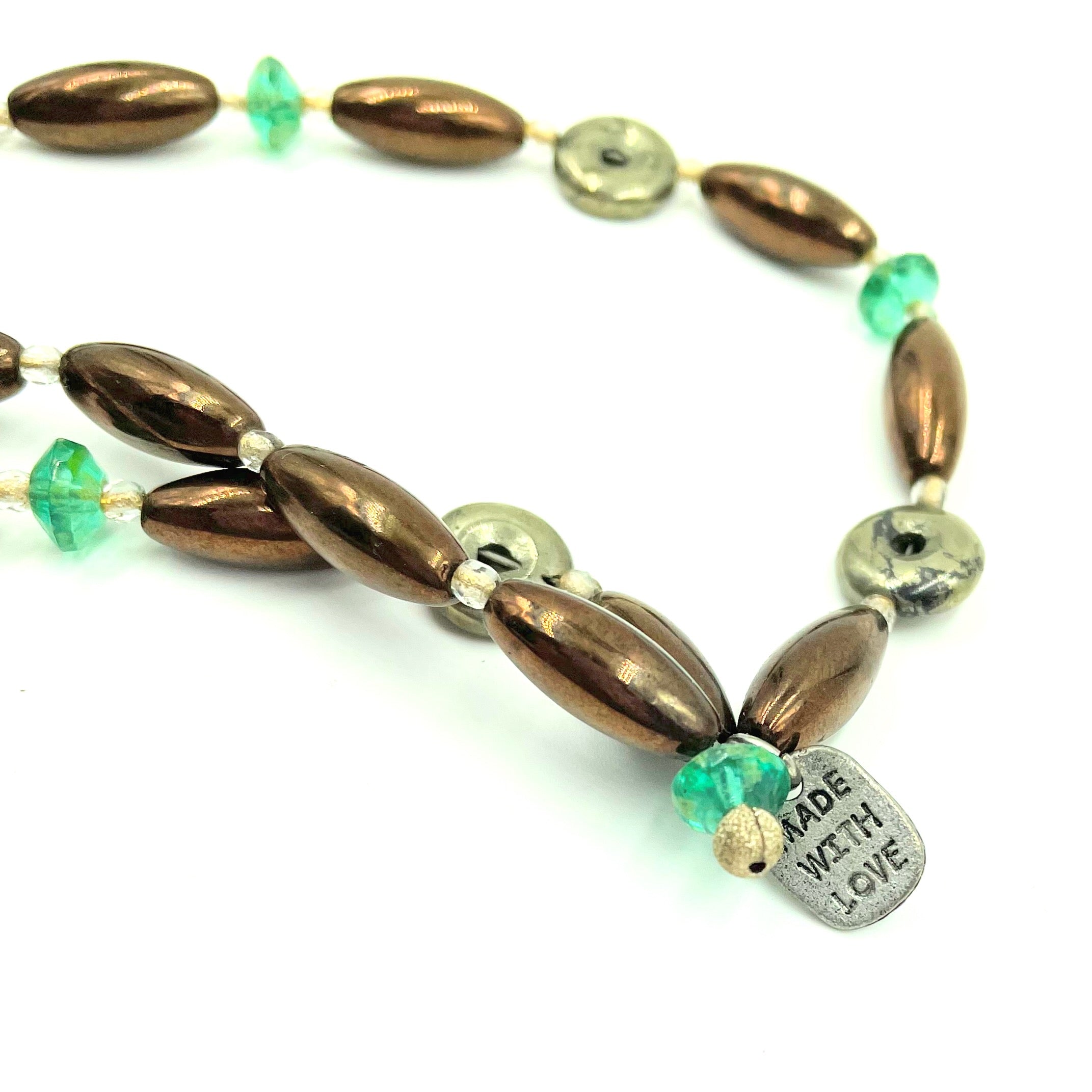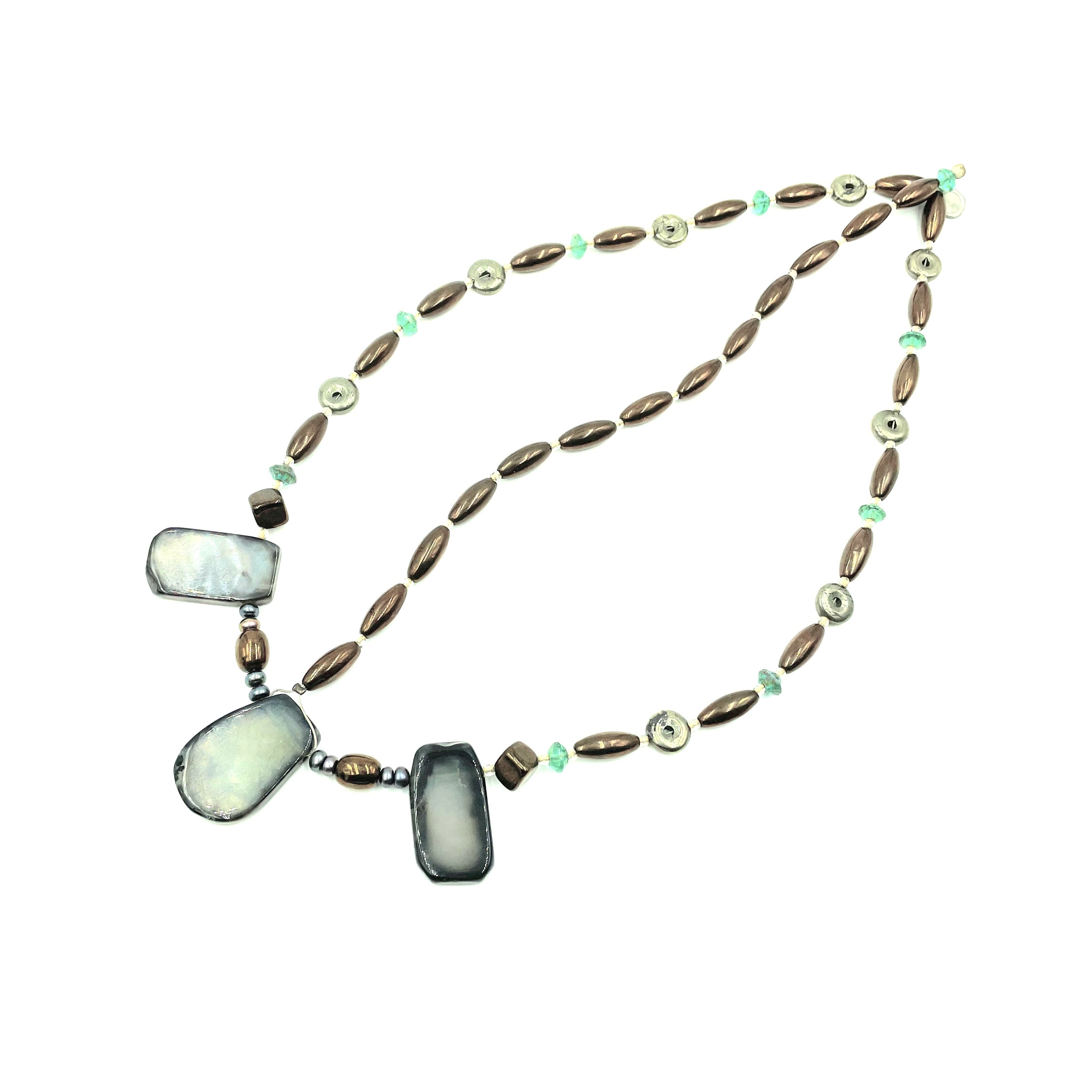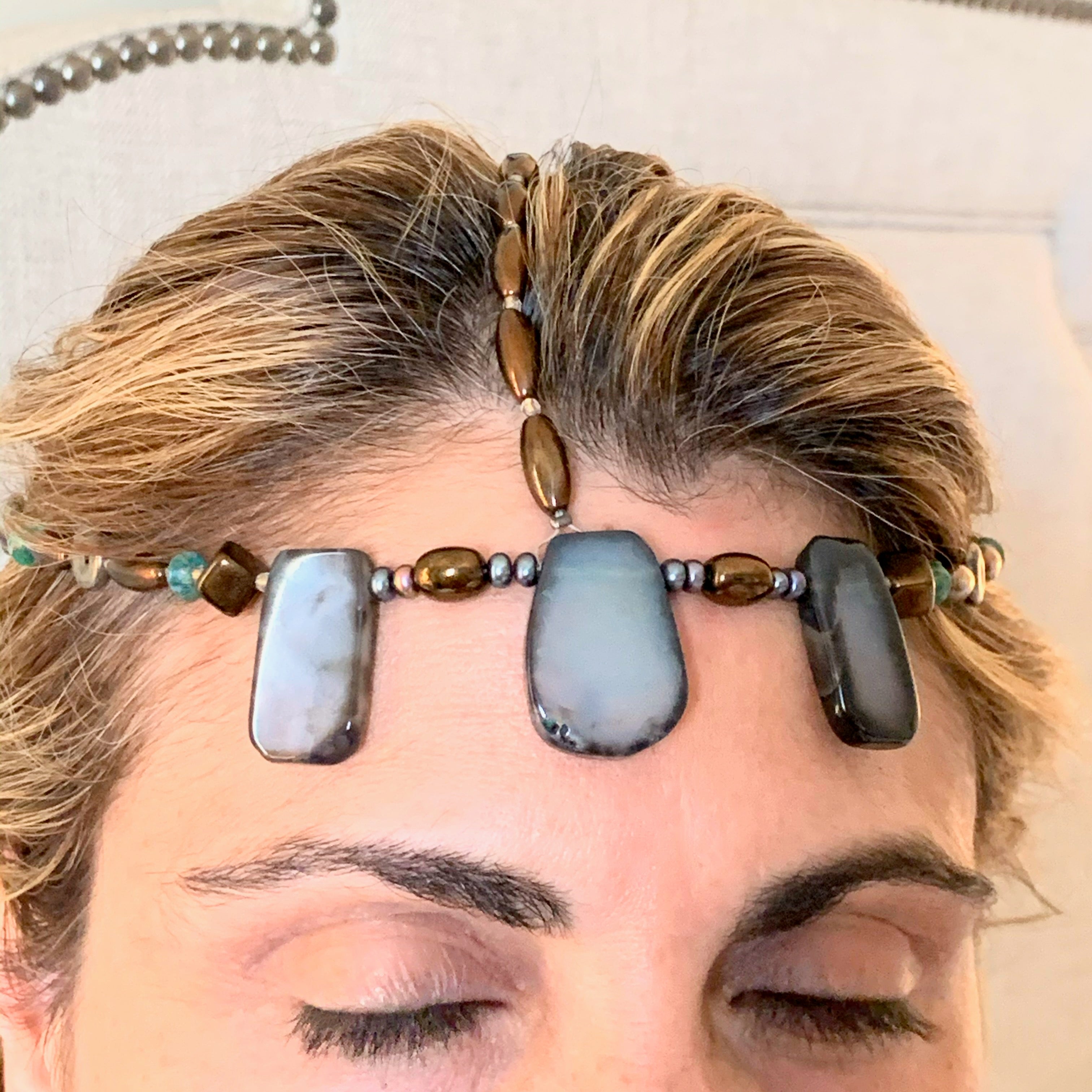 Agate offers spiritual insight and awakening and gives a cooling, calming sensation over the metaphysical third eye. Hematite accents offer grounding and strength. Pyrite is good for stimulating confidence and mental clarity.