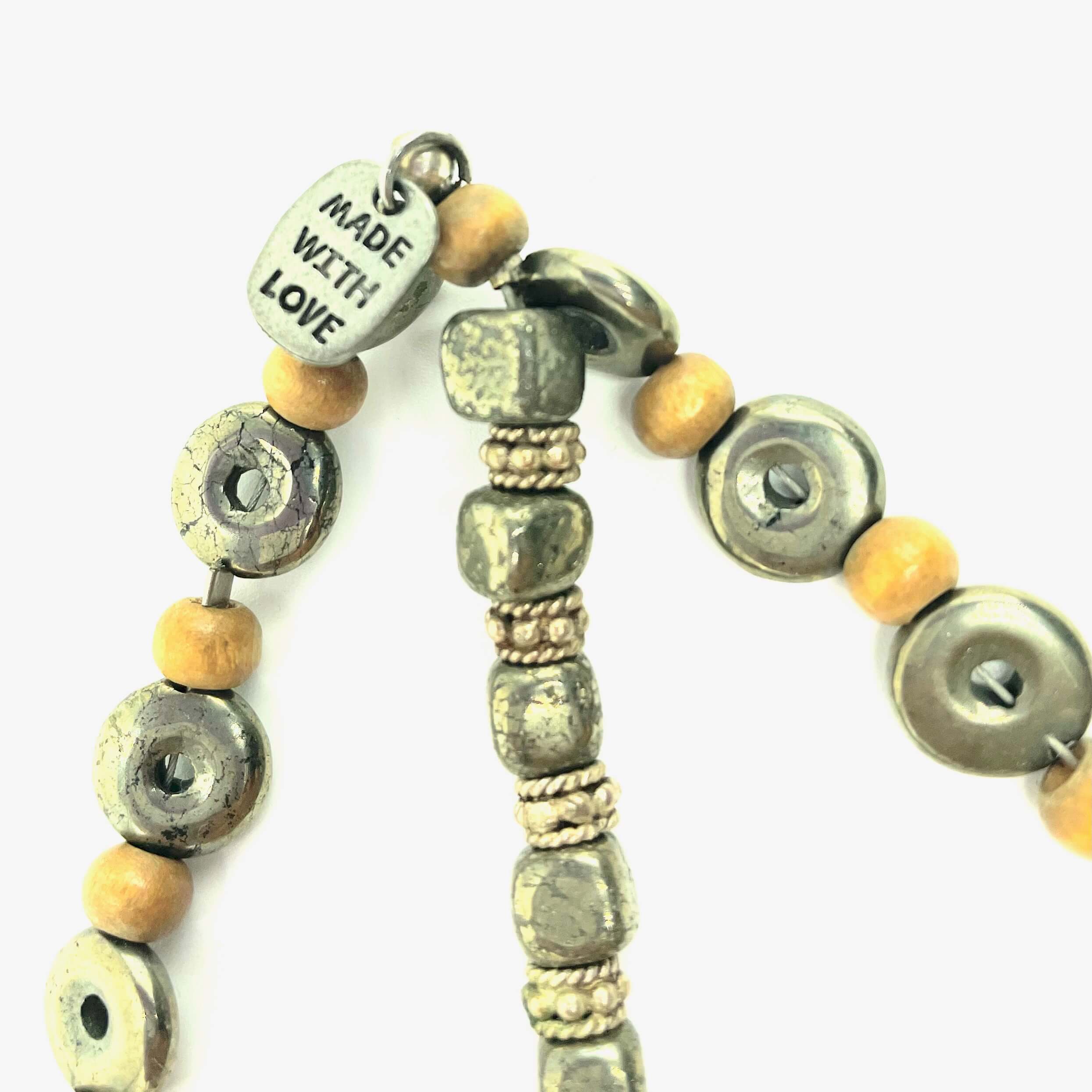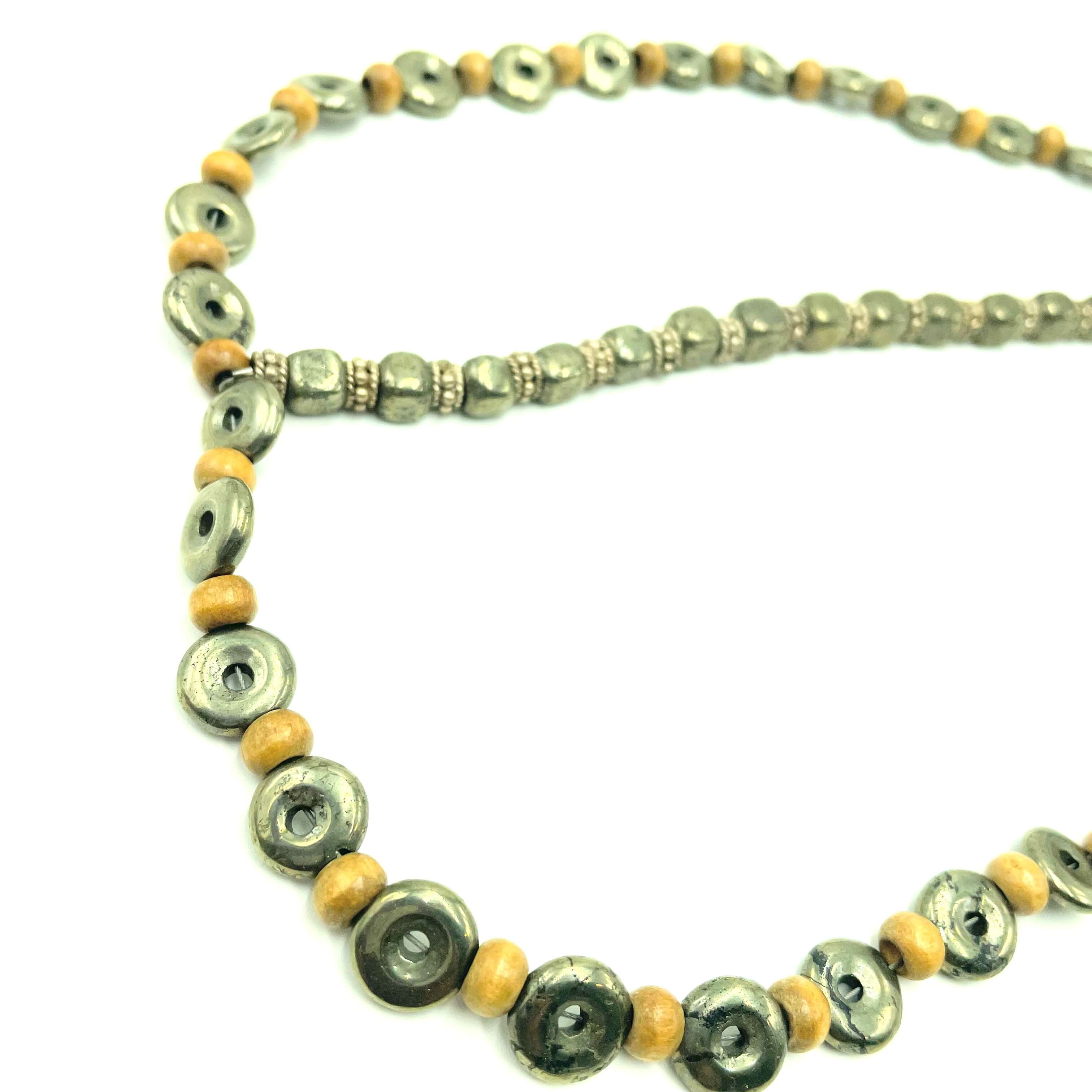 Pyrite, silver, and wood come together in this regal headdress designed for dreamers and modern queens alike. Faceted pyrite beads bring a subtle metallic glow while supporting confidence, protection, and sharp mental focus, complemented by cool silver and warm wooden accents for a grounded, organic feel.