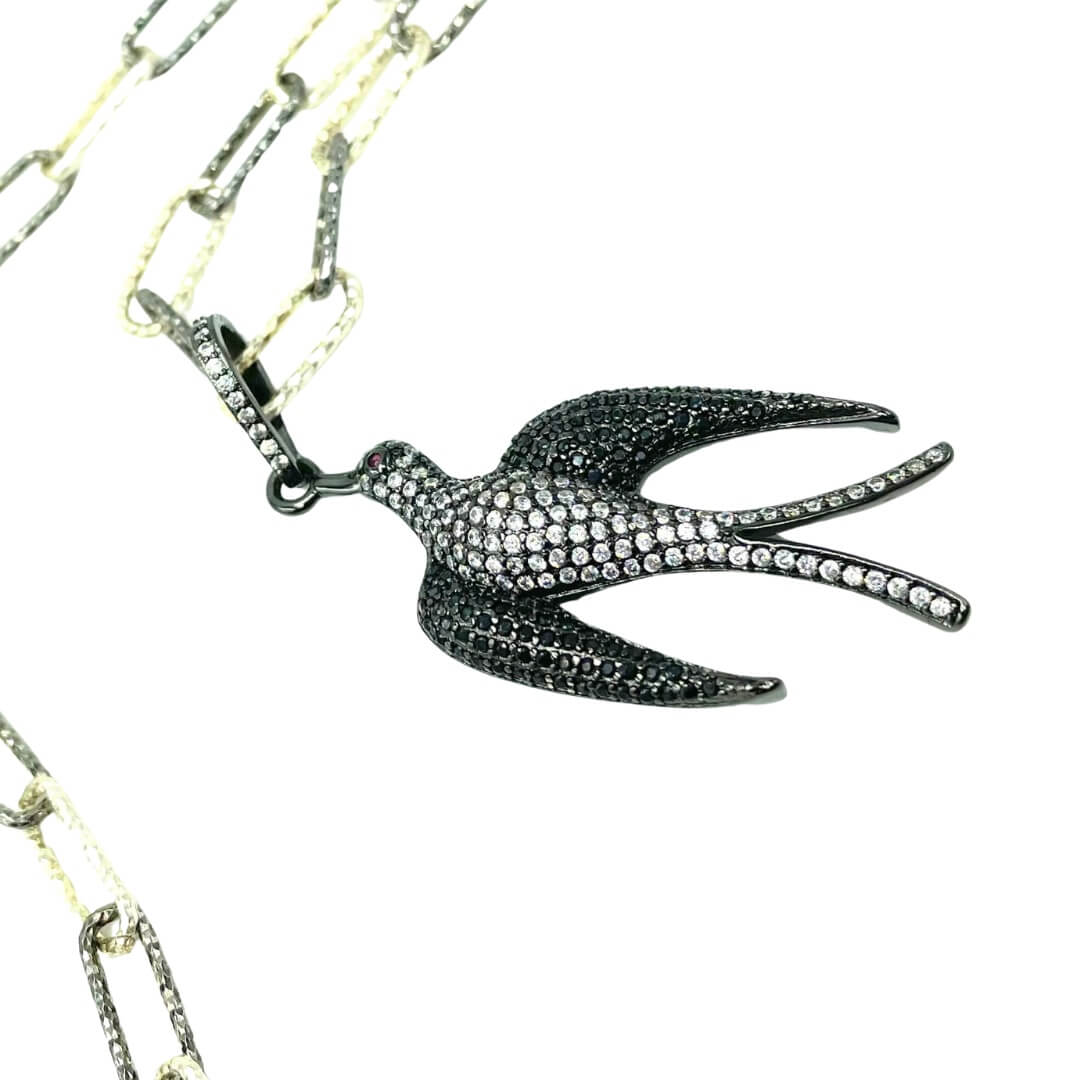 A sparkling bird to set you free on adventures, representing infinite possibilities. Wear her day into night; the diamond cut oxidized flexible length chain lets you decide the best for each outfit, or can be worn separately. Cubic zirconia and marcasite set in sterling silver compose this captivating avian creature with a ruby red eye. Easy to use lobster claw clasp.