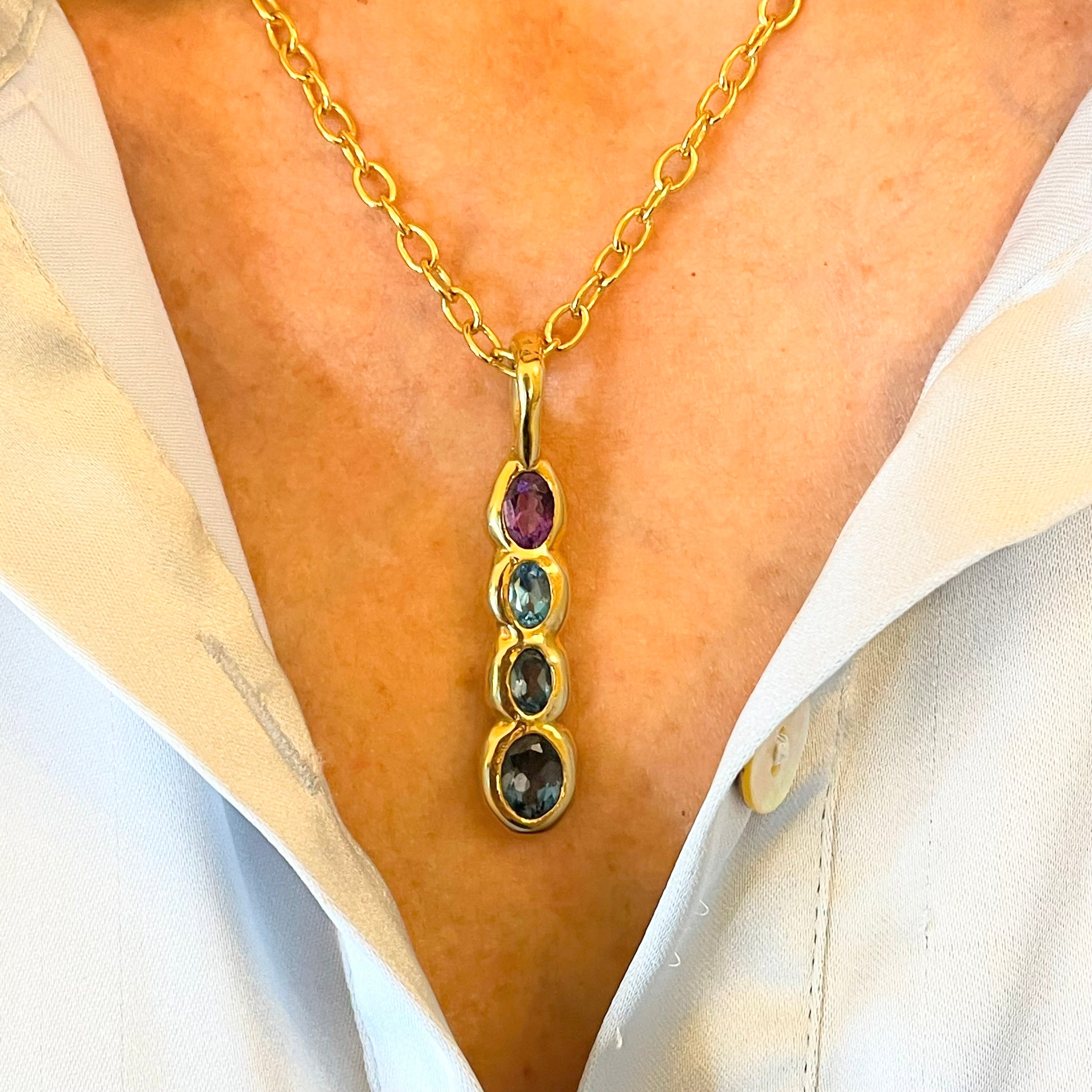 The Ophelia Four Gemstone Necklace captures the breathtaking gradient of evening skies, flowing from the rich purple depths of Amethyst through the infinite blues of Topaz. Originally designed using traditional wax carving and hand-forging techniques, this pendant features four complementary ombré ovals that create a stunning cascade of color from violet to the deepest ocean blue.