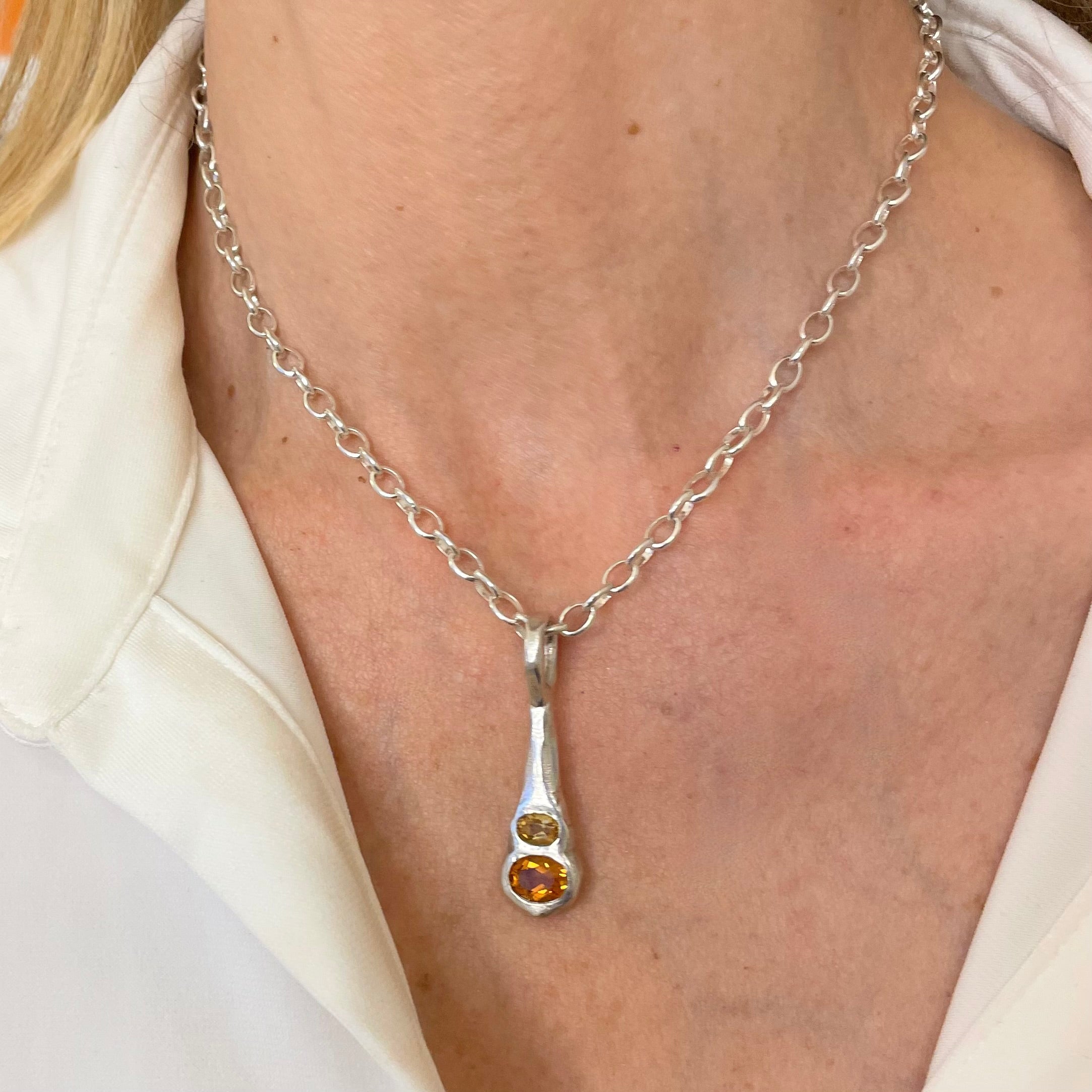 The Olivia Pendant captures the golden rays of the sun in all their warming glory. Originally designed using traditional hand-forging techniques, this pendant features complementary gemstone ovals that flow seamlessly from the rich, amber depths of dark orange Citrine to the luminous warmth of light orange Citrine.