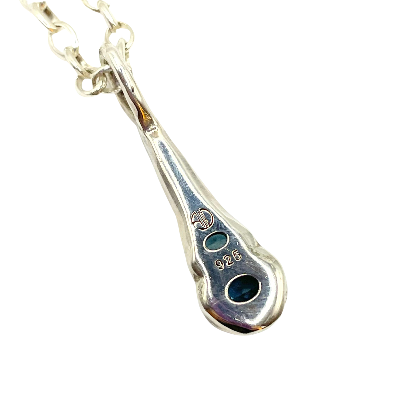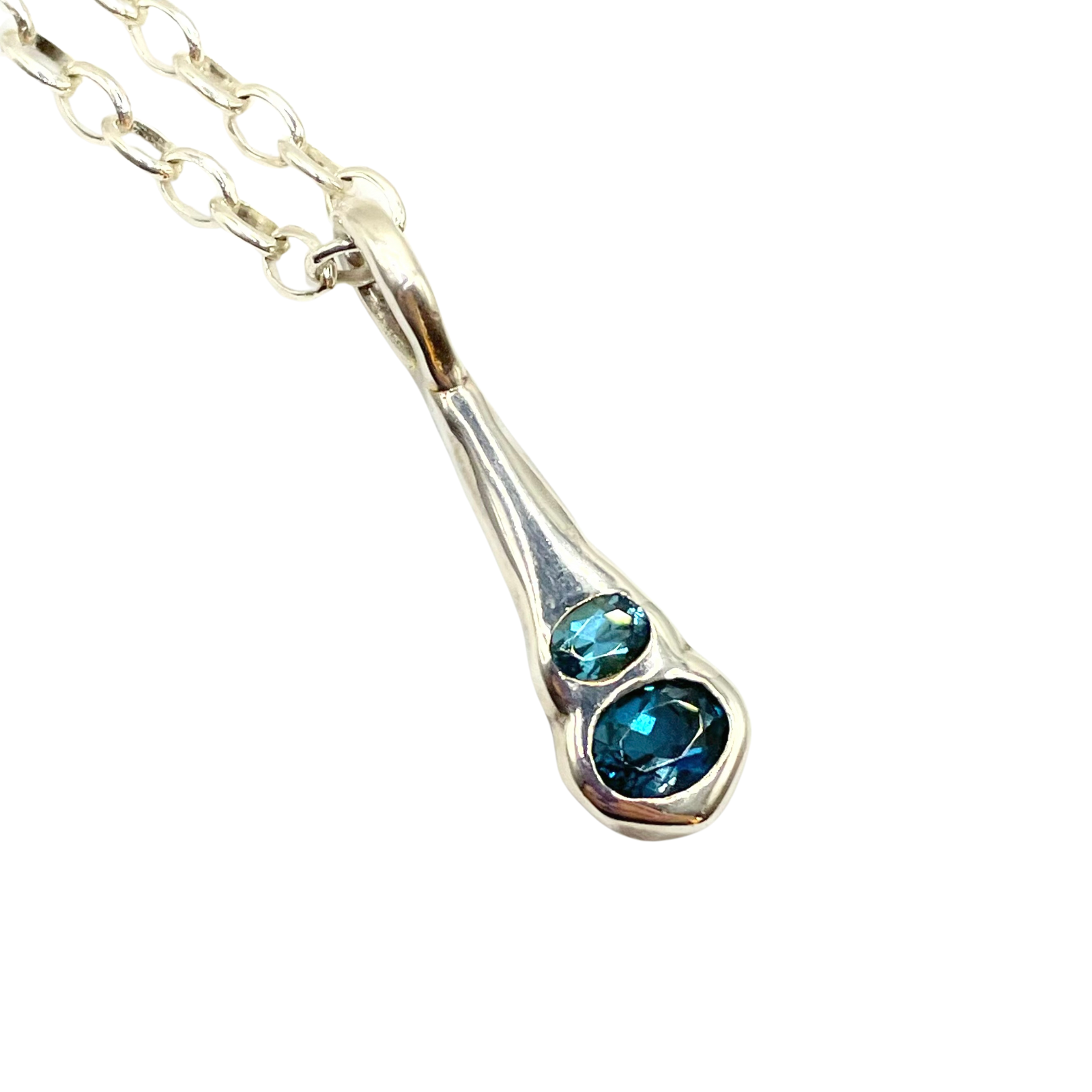 The Olivia Pendant captures the mesmerizing gradient of deep ocean waters through two stunning blue topaz gemstones. Originally designed using traditional hand-forging techniques, this pendant features complementary ombré ovals that flow seamlessly from the rich, sophisticated depths of London Blue to the crystalline clarity of Sky Blue Topaz.
