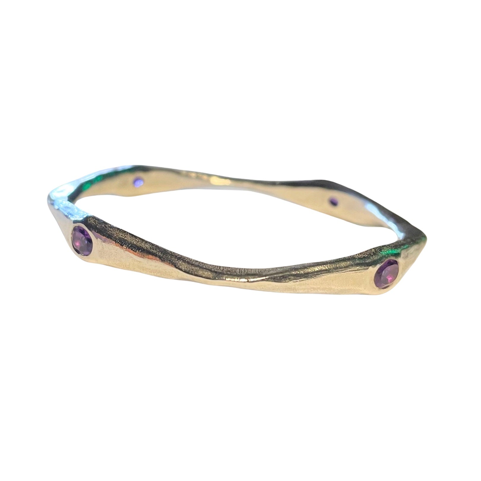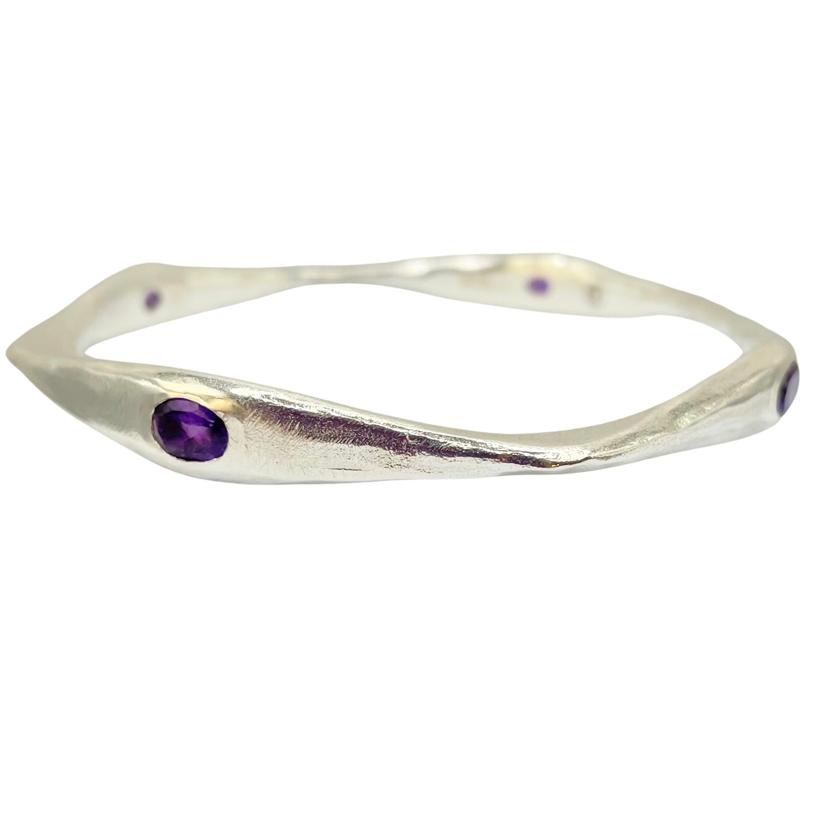 The Brooke Bangle reimagines classic arm candy with modern artistry and serene energy. Originally designed using traditional hand-forging techniques, this isn't your typical bangle – it's a sculptural masterpiece that undulates gracefully around your wrist. Four genuine Purple Amethyst gemstones are strategically placed on each side, creating a continuous sparkle of tranquil violet that catches light from every angle.