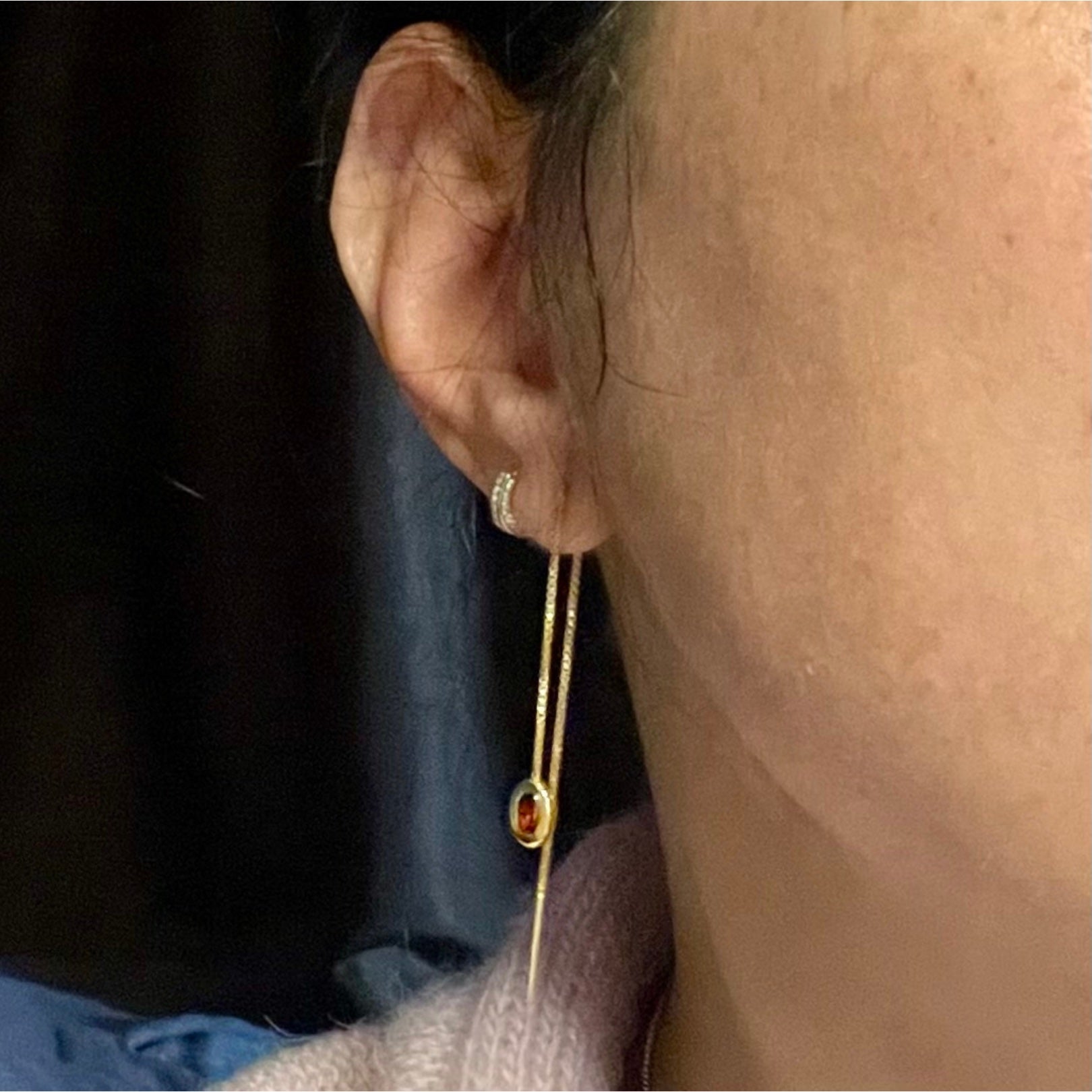 The Thelma Threader Earrings unleash your inner stylist with infinite possibilities at your fingertips. These aren't your typical earrings – they're interactive jewelry art that lets you control the drama. Thread the chain through your piercing at varying lengths to create your perfect drop, or weave them through multiple piercings for an avant-garde ear statement, showcasing a genuine Red Garnet gemstone that dances with every movement.