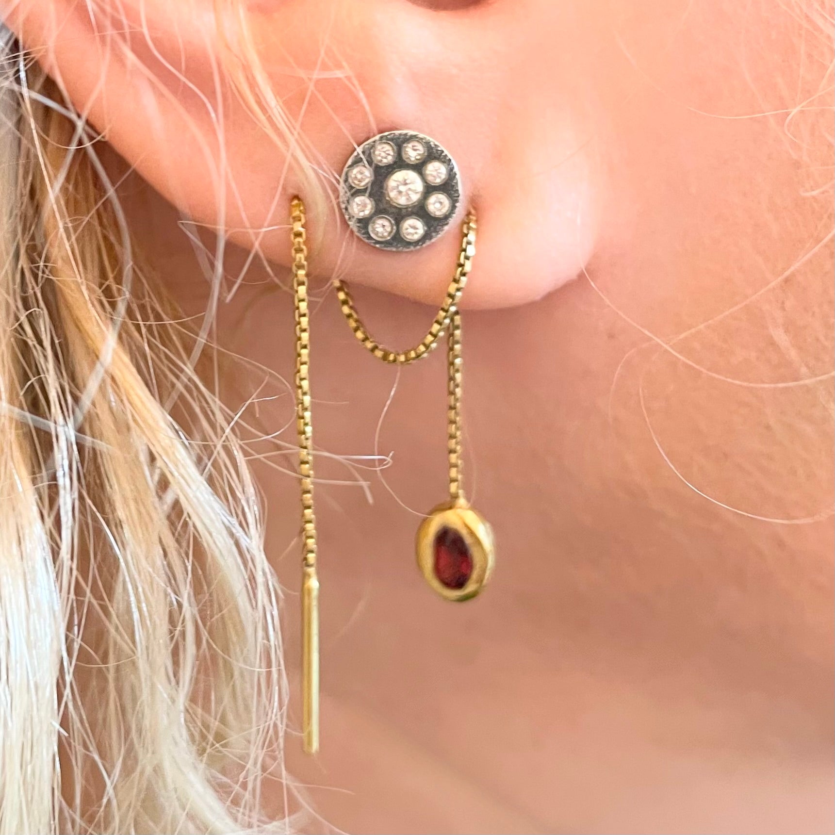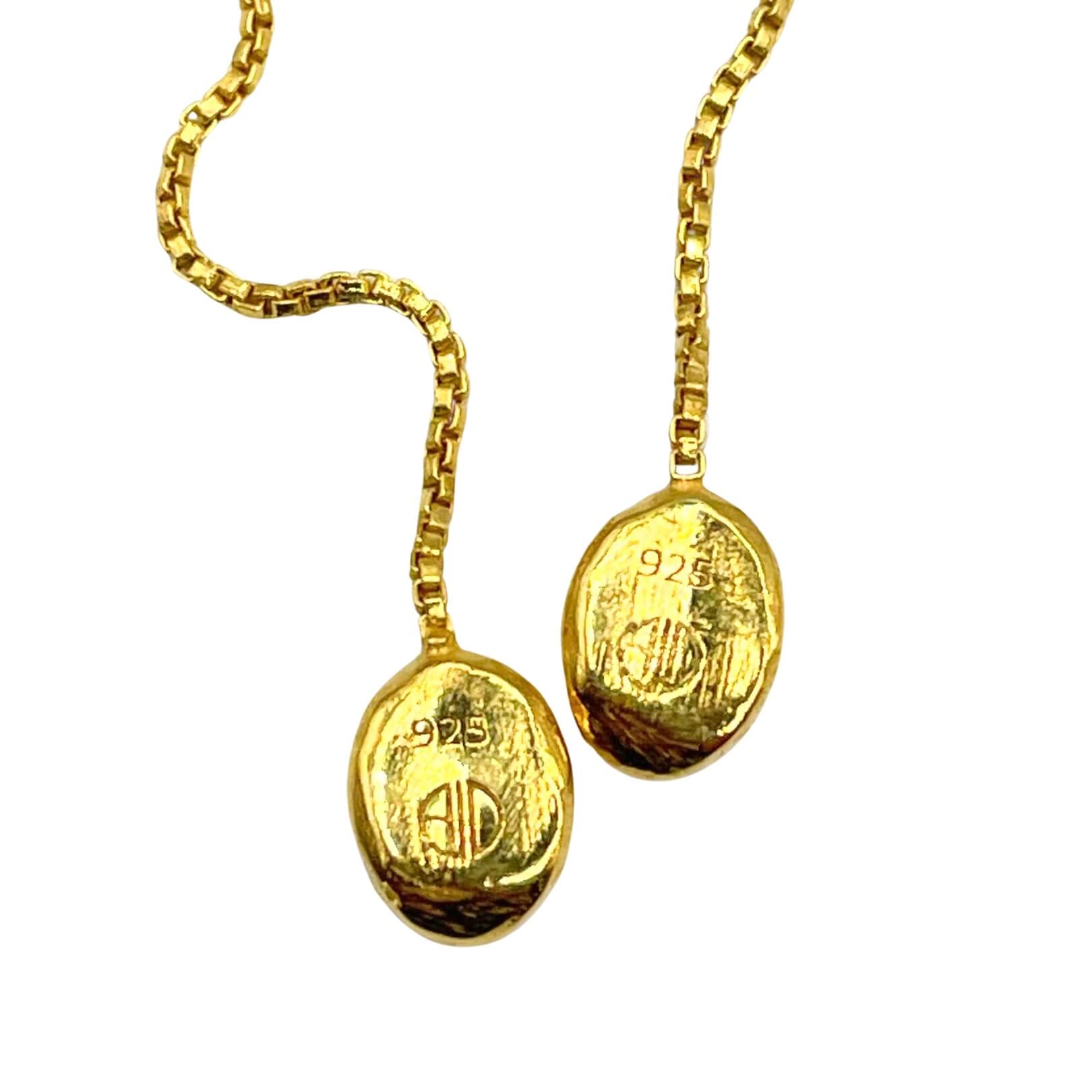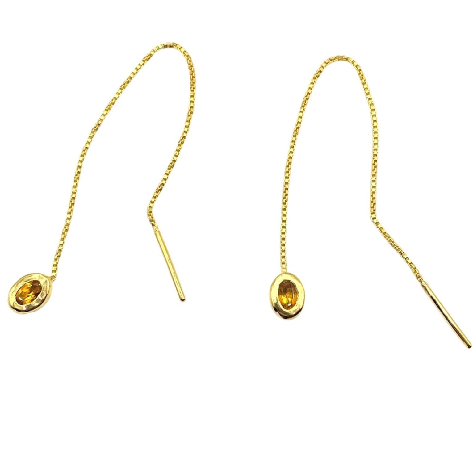 The Thelma Threader Earrings unleash your inner stylist with infinite possibilities at your fingertips. These aren't your typical earrings – they're interactive jewelry art that lets you control the drama. Thread the chain through your piercing at varying lengths to create your perfect drop, or weave them through multiple piercings for an avant-garde ear statement, showcasing a genuine Orange Citrine gemstone that dances with every movement.