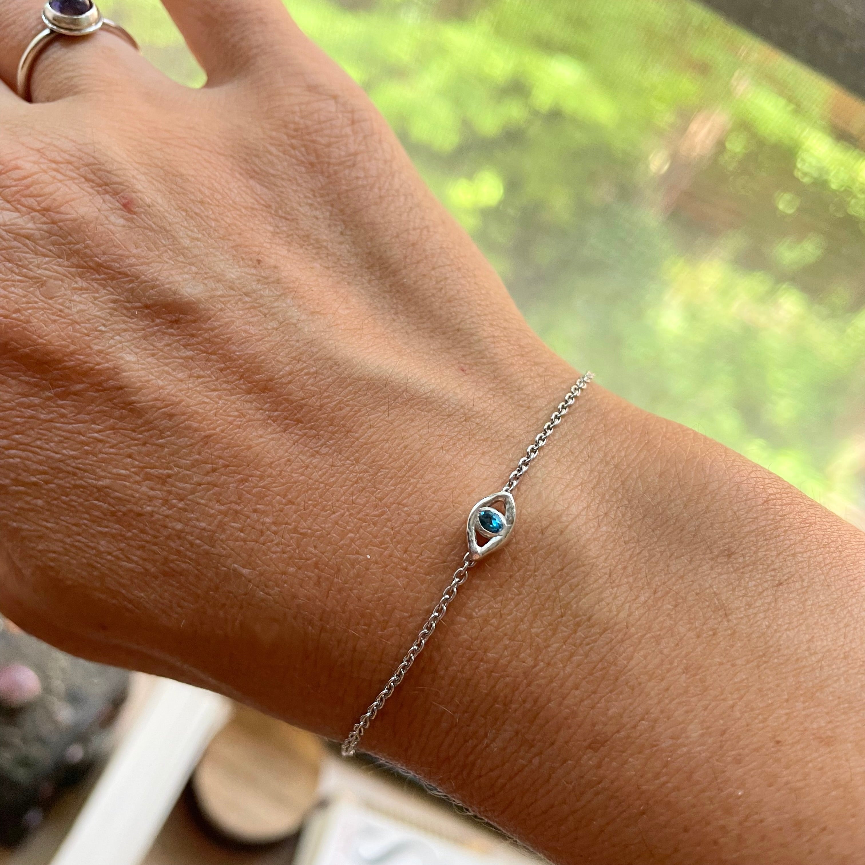 Embrace ancient wisdom with this exquisite handcrafted sterling silver bracelet, featuring our signature evil eye talisman centered with a hand-set oval London Blue Topaz. Revered across civilizations for millennia, this sacred symbol offers protection from negative energy while bringing calm confidence to your daily journey.