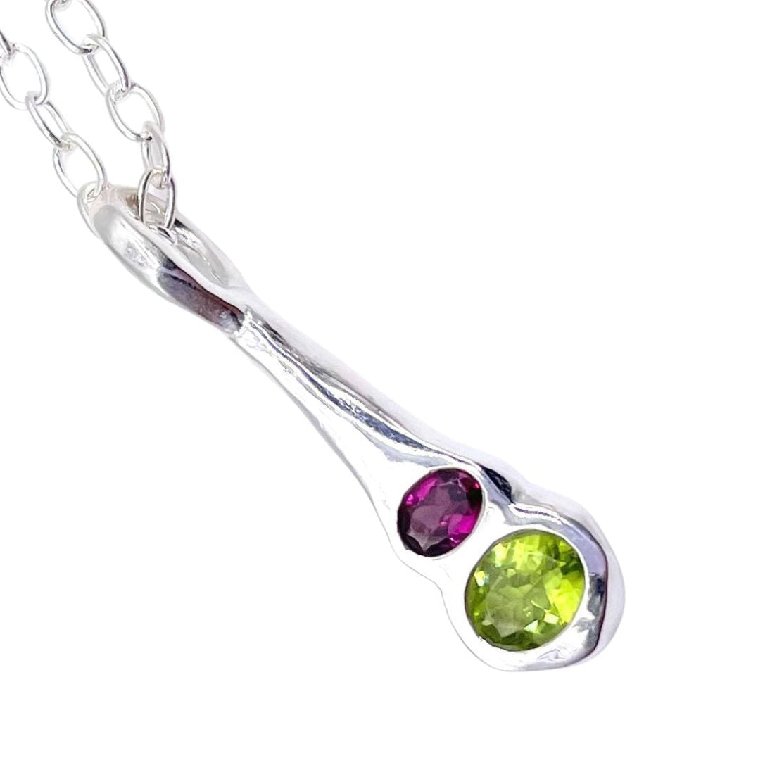 The Olivia Pendant captures the beauty of nature and emotion. Originally designed using traditional hand-forging techniques, this pendant features complementary gemstone ovals that flow seamlessly from the vibrant, fresh Green Peridot to the regal depths of Pink Rhodolite Garnet.