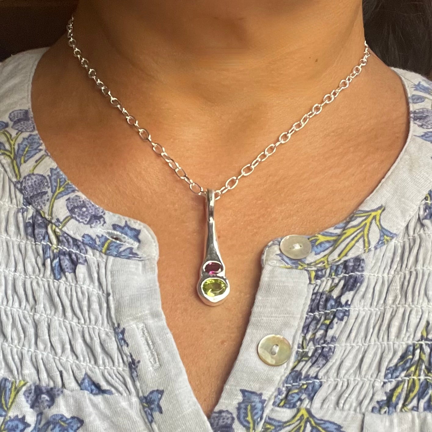 Amy Delson JewelryOlivia - Green Peridot, Pink Rhodolite Garnet Two Gemstone Pendant Necklace in Silver