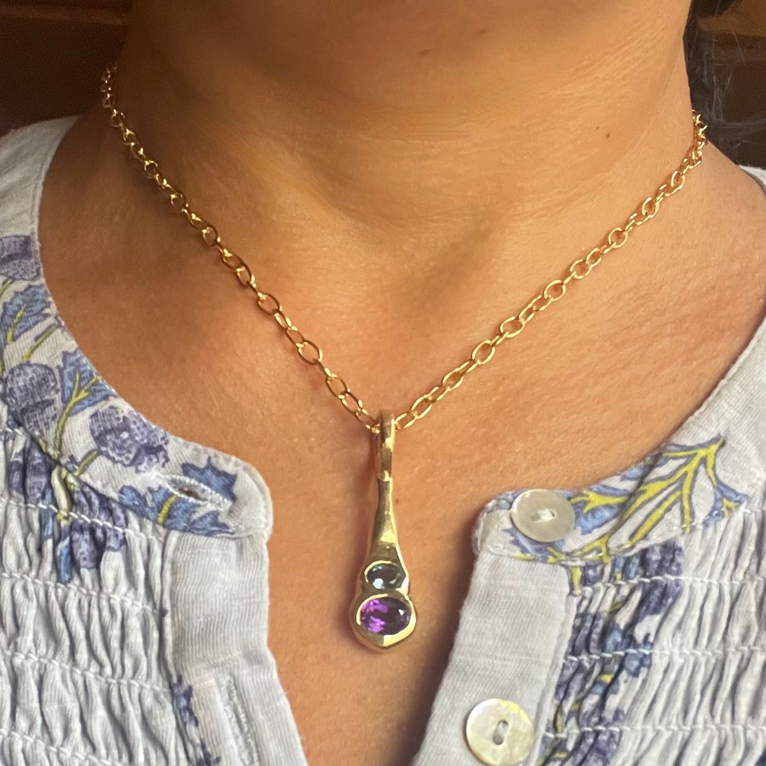 The Olivia Pendant captures the mesmerizing gradient of deep outer space through two stunning gems: London Blue Topaz and Purple Amethyst. Originally designed using traditional hand-forging techniques, this pendant features genuine gemstone ovals that flow seamlessly from the rich sophistication of London Blue Topaz to the crystalline clarity of Purple Amethyst.