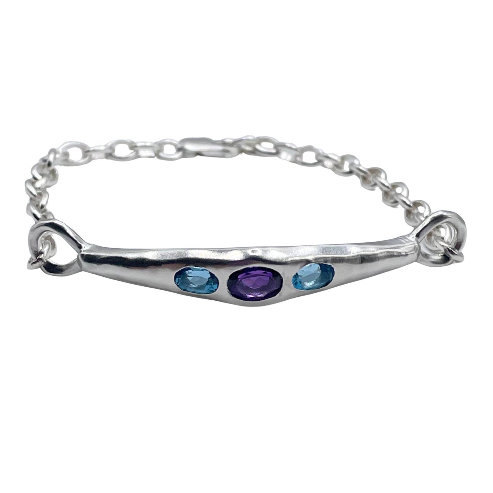 At the heart of Blair sits a stunning oval Purple Amethyst stone, beautifully showcased between two Swiss Blue Topaz stones. Known as a stone of calm and clarity, Amethyst, along with Blue Topaz, beloved for helping with communication and confidence, transform this bracelet into a meaningful talisman you'll reach for every day.